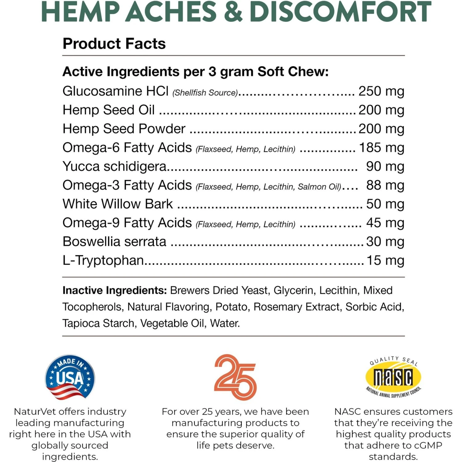 Help support your pup’s joint health and mobility with NaturVet Hemp Aches & Discomfort Plus Hemp Seed Dog Soft Chews. These tasty, wheat-free chews are formulated with beneficial ingredients like hemp seed oil and powder, glucosamine, yucca schidigera and L-Tryptophan to help alleviate aches and pain associated with your dog’s daily activities, like exercise. This supplement is made in the USA and formulated by veterinarians, so you can feel confident feeding them to your canine companion!