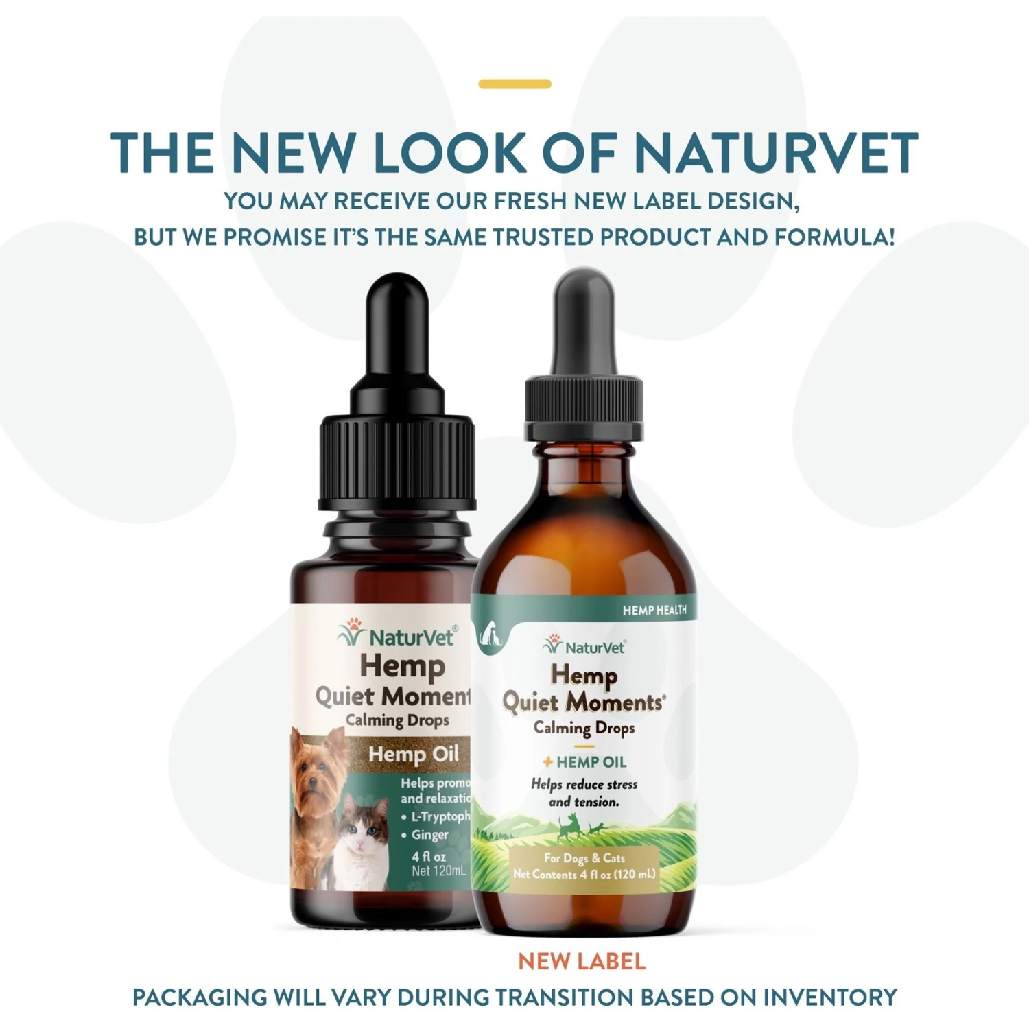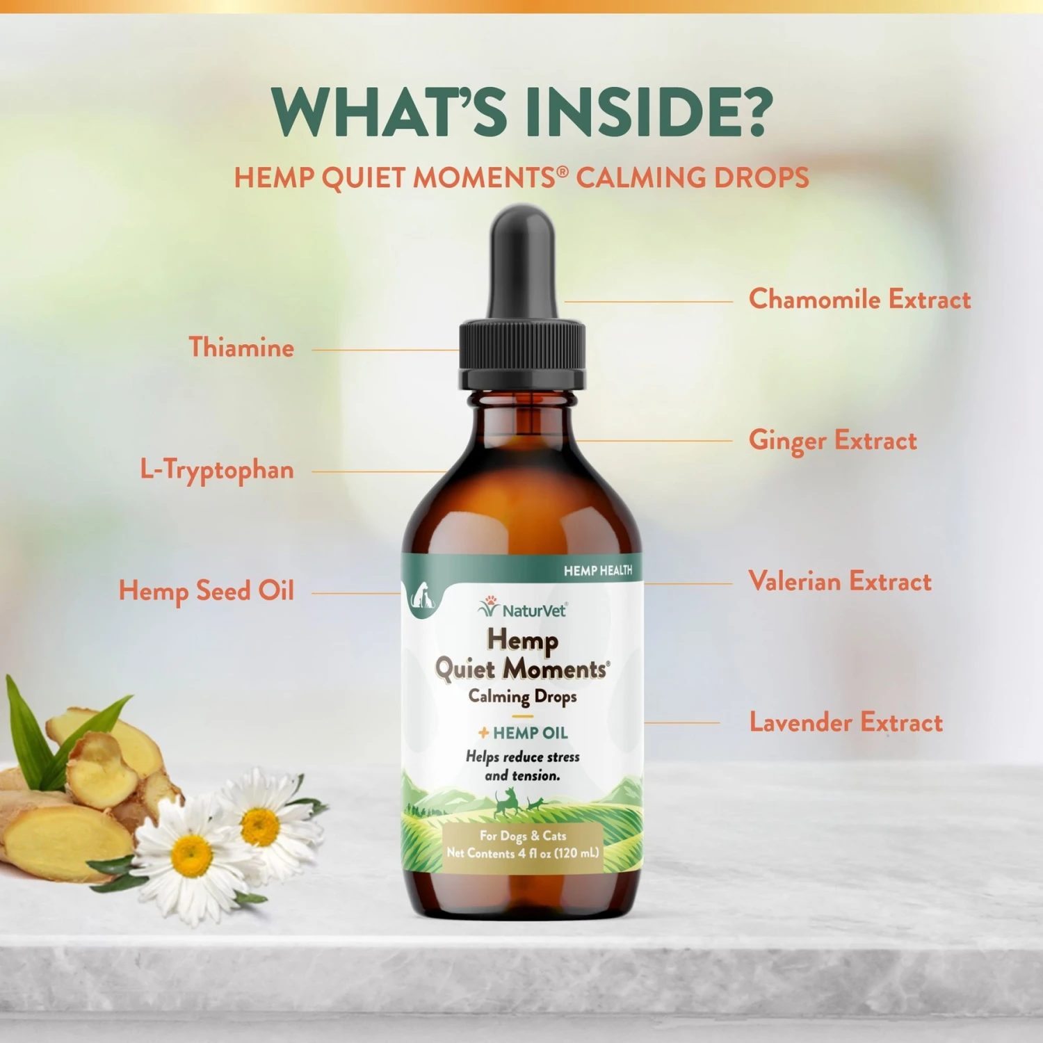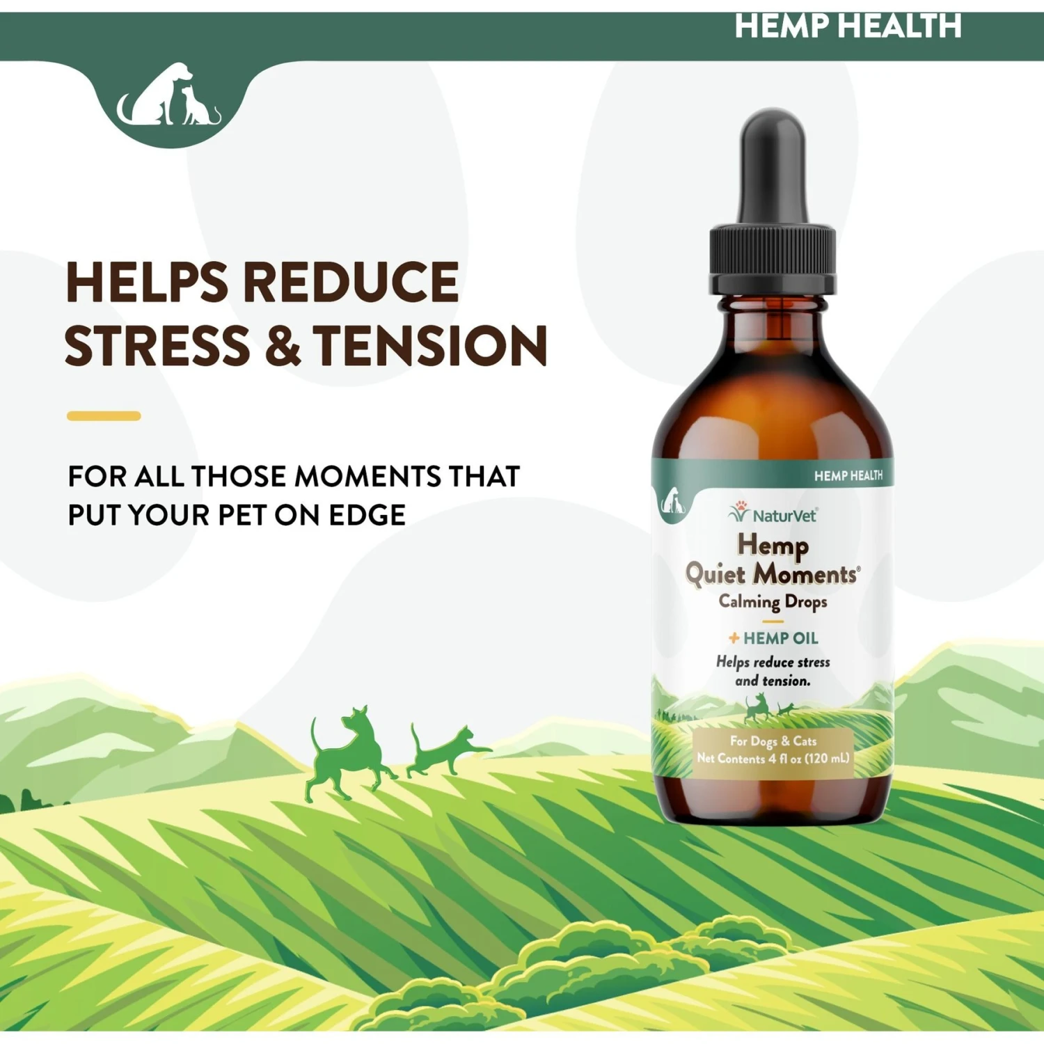 Help your furry friend feel more relaxed during stressful times with NaturVet Hemp Quiet Moments Calming Drops Hemp Oil Dog & Cat Supplement. It features a unique blend of thiamine, L-tryptophan, chamomile, ginger, valerian and hemp seed oil to help promote rest and relaxation in your paw-tner. This supplement contains ginger to support sensitive stomachs, especially during travel, and is ideal for daily stressors like fireworks, thunderstorms, separation and trips to the vet or groomer. Made in the USA, NaturVet Hemp Quiet Moments Calming Drops Hemp Oil Dog & Cat Supplement can be used for companions over 12 weeks of age.
