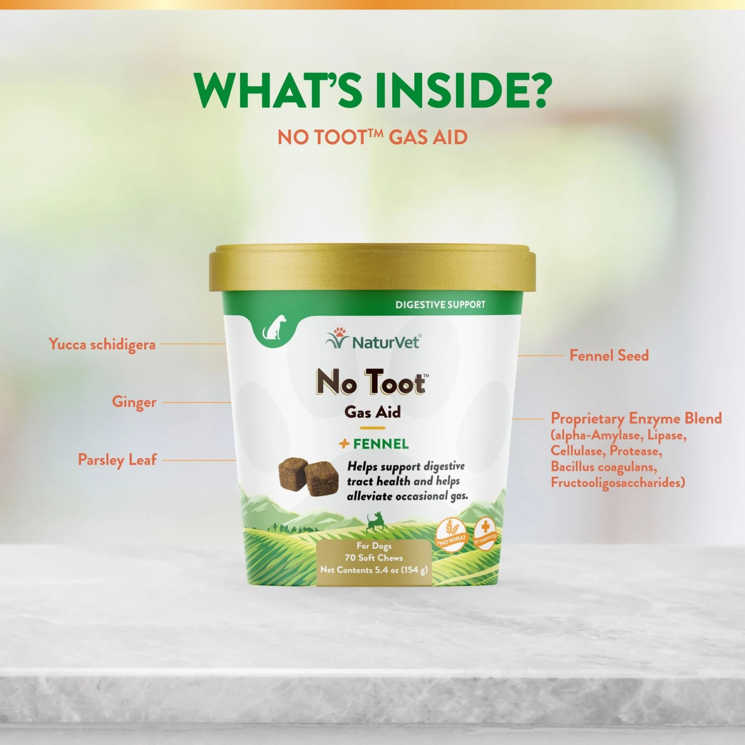 Keep your pooch healthy, moving and gas free with NaturVet No Toot Plus Fennel Soft Chews Digestive Supplement for Dogs! It’s formulated by veterinarians in the USA with a special proprietary blend to help support and balance the digestive system of your furry friend. Created to help alleviate your dog’s intestinal gas, these delicious soft chews help reduce stool and urine odors and are made with active ingredients—Yucca Schidigera, Ginger, Parsley Leaf, Fennel Seed and Proprietary Enzyme Blend. For best results, do not feed your pet table scraps.
