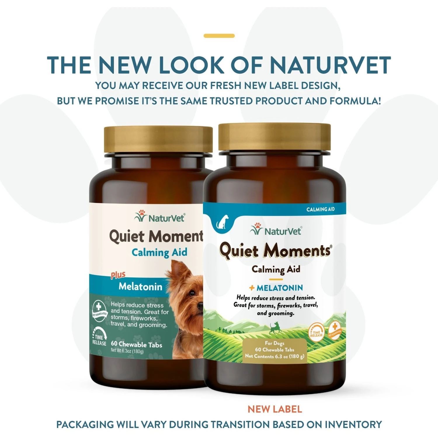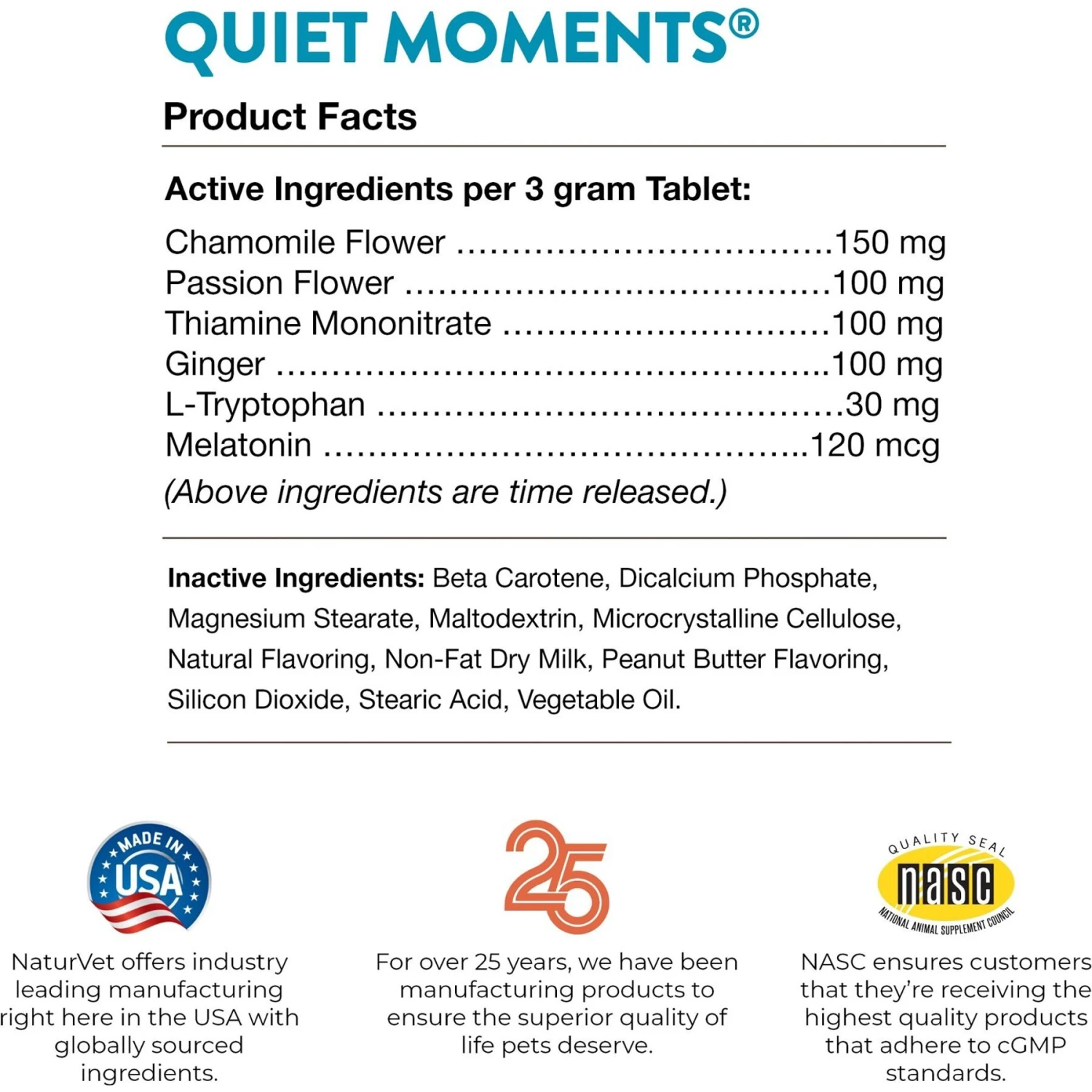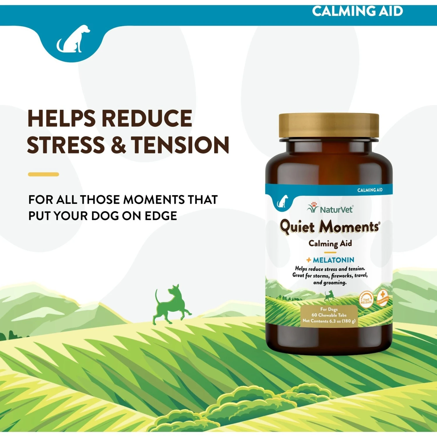Keep your pup calm with NaturVet Quiet Moments Chewable Tablets Calming Supplement for Dogs! These tasty, chewable tablets are made with a soothing blend of thiamine, L-tryptophan, and melatonin, which promote sleepiness and a sense of calm in dogs twelve weeks and older. The infused ginger helps soothe nervous tummies as well. This time release formula makes it paw-fect for helping your dog through scary events like travel, storms, and vet visits. It helps regulate your dog’s nervous systems and relieves symptoms of stress. Simply dose as instructed to keep your little guy calm during those tough stages in life.