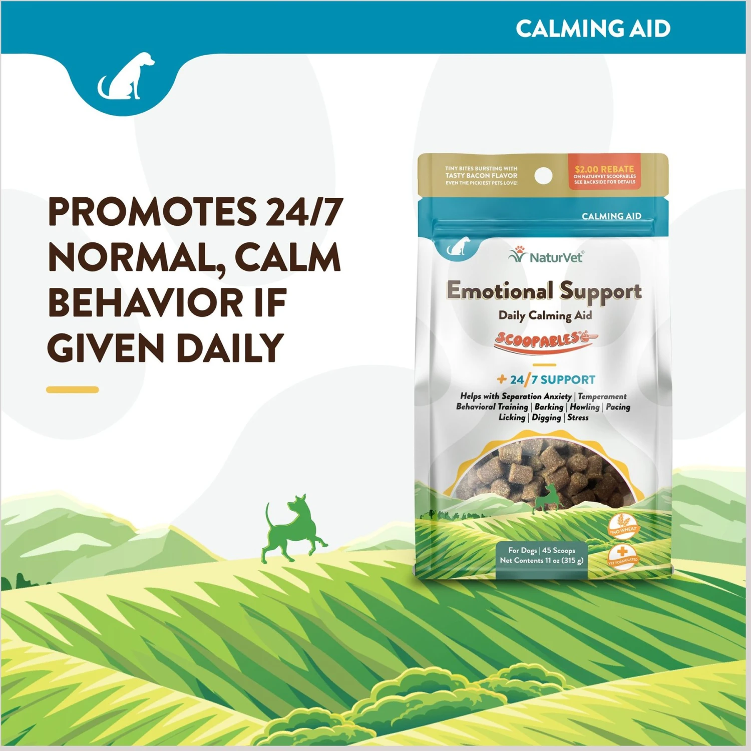 The NaturVet Scoopables Emotional Support Daily Calming Aid Dog Supplement is a paw-some choice for pups with separation anxiety, stress and general nervousness. When given daily, it promotes normal and calm behavior in your furbaby and may help with unwanted behaviors like howling, barking, pacing, licking and digging. This daily calming aid features a blend of botanical ingredients like magnesium, passion flower, chamomile and melatonin. Those ingredients work together to help your best friend maintain a normal emotional balance. This supplement is su-paw tasty and is bursting with hickory smoked bacon flavor, so it’s paw-fect even for picky eaters.