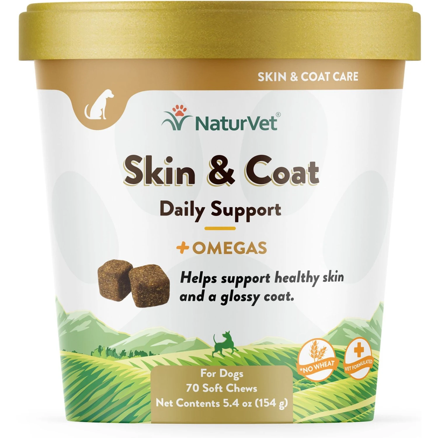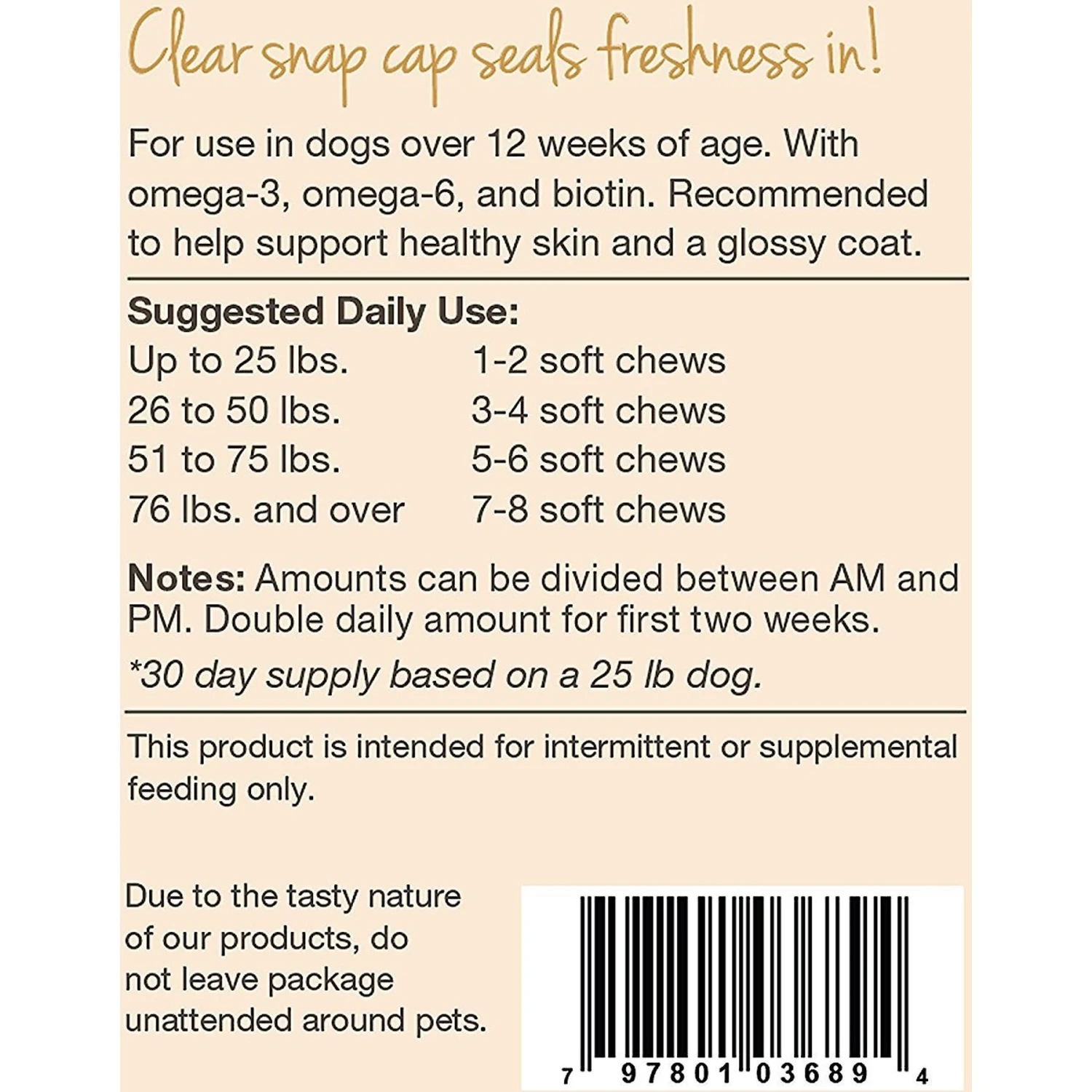 Formulated with only the highest quality of all natural active ingredients, Skin & Coat Soft Chews are recommended to help support healthy skin and a glossy coat. Rich in Omega 3, 6, and biotin. Recommended to help support healthy skin and a glossy coat. Plus Breath Aid to support fresh breath.