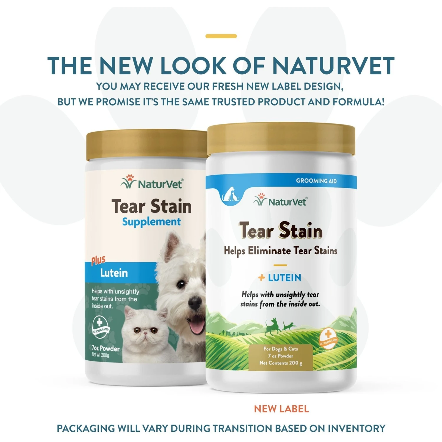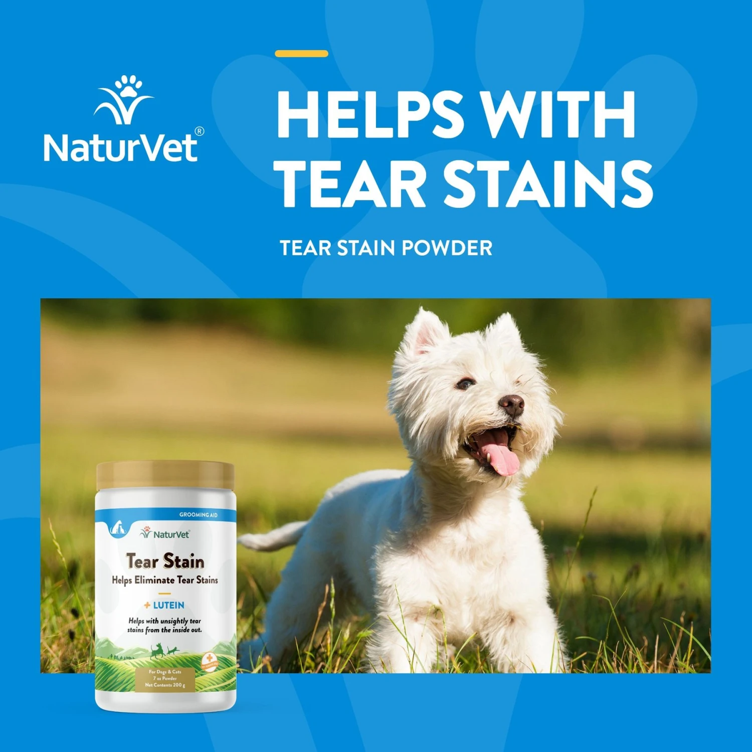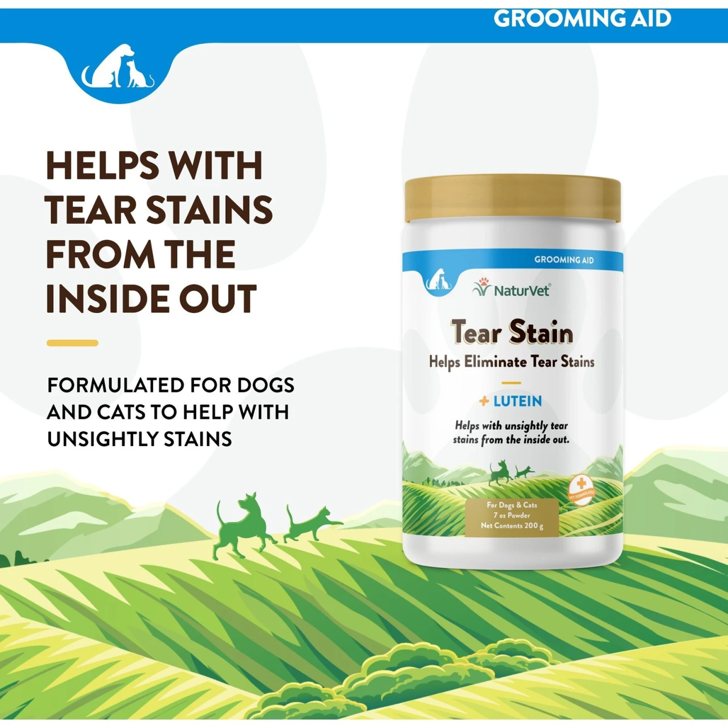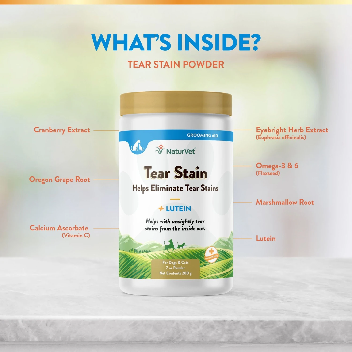 Say so long to unsightly tear stains with NaturVet Tear Stain Plus Lutein Powder Vision Supplement for Cats & Dogs. This daily supplement is formulated to support your pet’s immune system and treat tear stains from the inside out. Each scoop features lutein, a carotenoid essential for good eye health. It also includes marshmallow root to help lubricate mucus membranes plus Oregon grape root, a natural antimicrobial. This veterinarian-formulated supplement is paw-fect for dogs and cats ages 12 weeks and older.