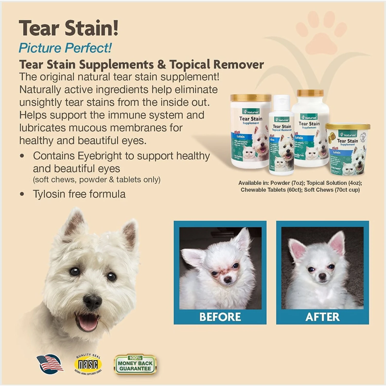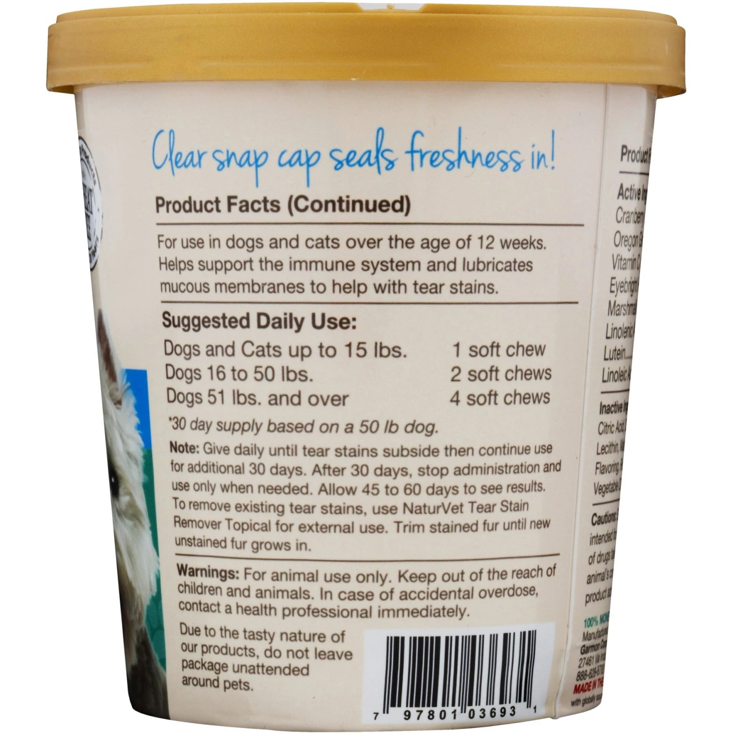 NaturVet Tear Stain Plus Lutein Soft Chews Vision Supplement for Cats & Dogs, 70 count — Say “too-da-loo” to unsightly tear stains with NaturVet’s Tear Stain Supplement! These soft and tasty chews are made in the USA without wheat and feature lutein—a carotenoid vitamin that’s related to vitamin A and often found in vegetables and fruits like broccoli, kale, spinach, kiwi, grapes and more! This veterinarian formulated supplement is also crafted with other natural active ingredients to support your BFF’s immune system and helps lubricate mucous membranes to stop tear stains, so you can see your pet’s loving eyes again!